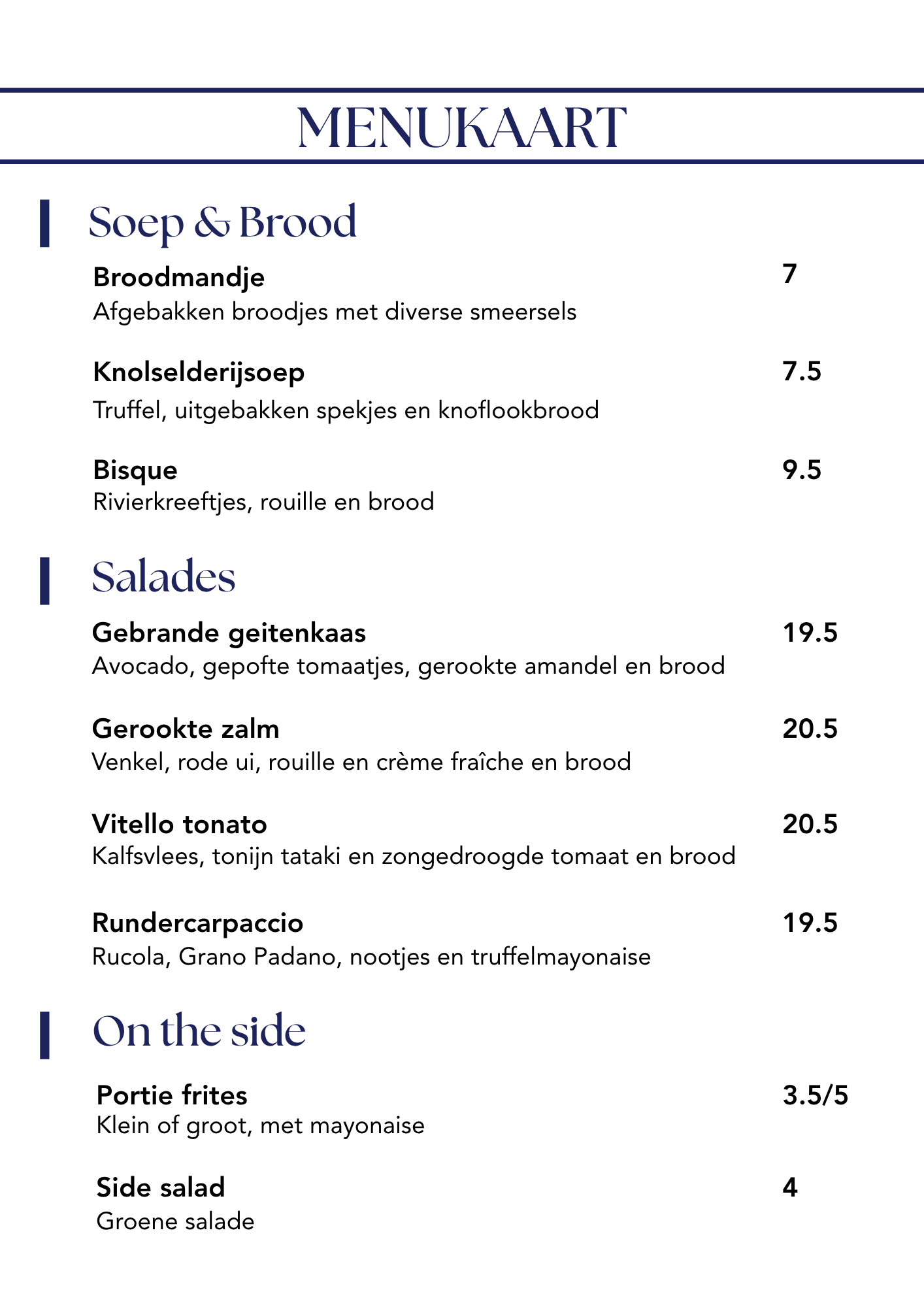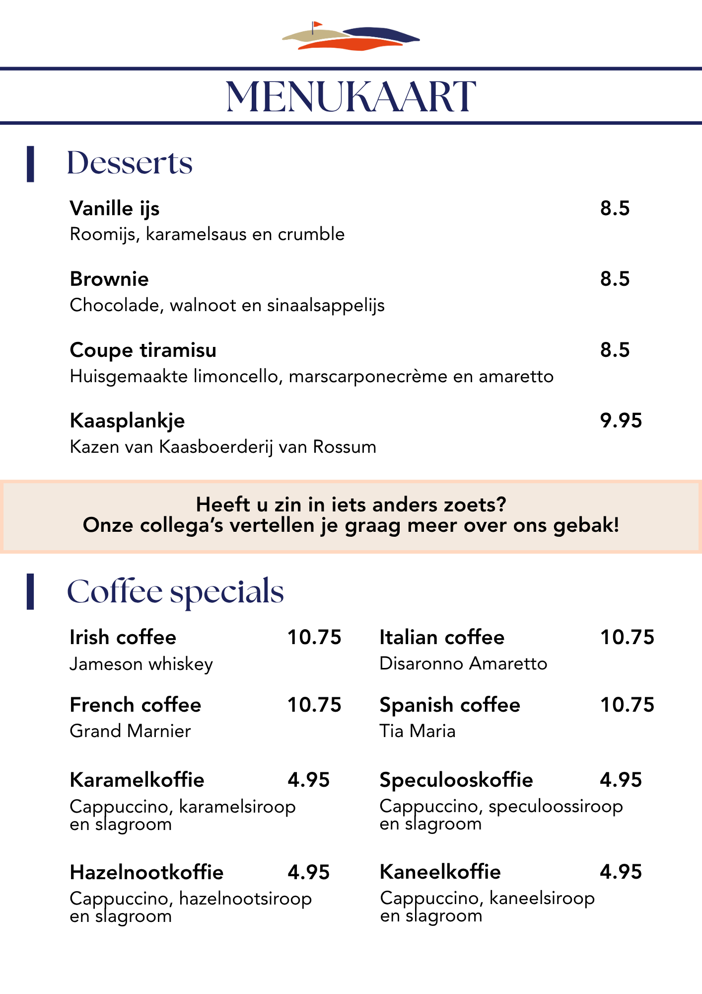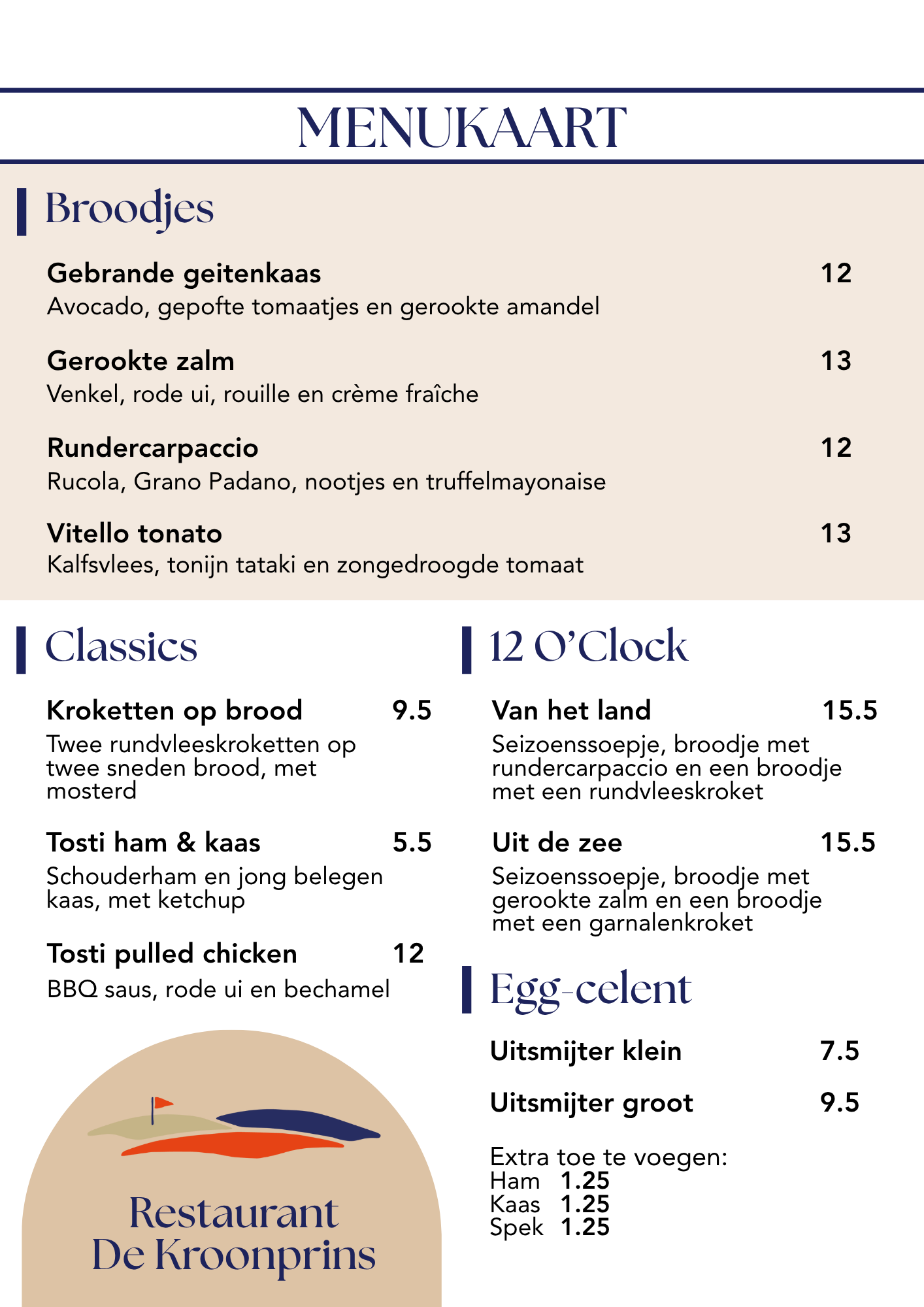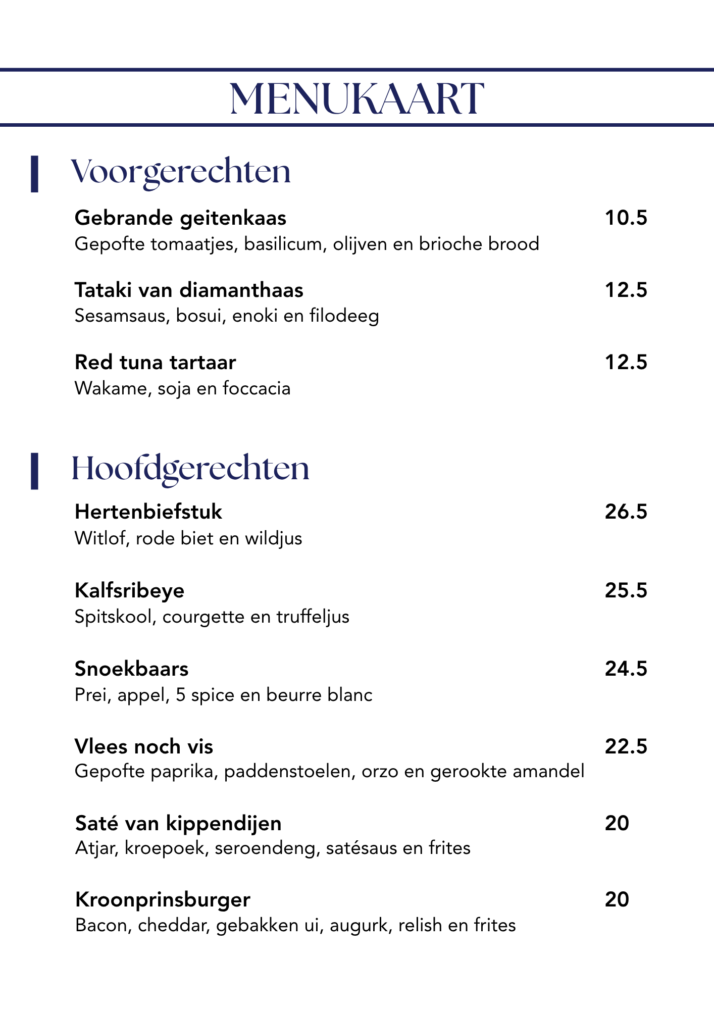 Tot een uur voor sluitingstijd kunnen er gerechten van de kaart besteld worden. Bittergarnituur is beschikbaar tot 30 minuten voor sluitingstijd.
